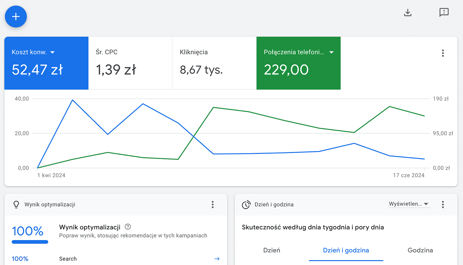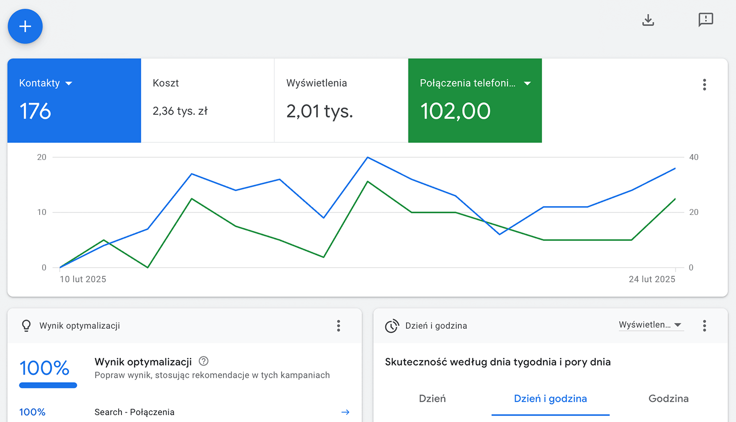 2,5-krotnie więcej telefonów i kontaktów. Za połowę ceny. Dla klienta od lat reklamującego się w Google, obniżyłem koszt pozyskania klienta o 50%. Pozwoliło to zwiększyć liczbę kontaktów z ok. 24 do ponad 60 miesięcznie. Co szczególnie ważne dla tej niewielkiej firmy usługowej, wzrost ten osiągnęliśmy bez podnoszenia budżetu reklamowego.