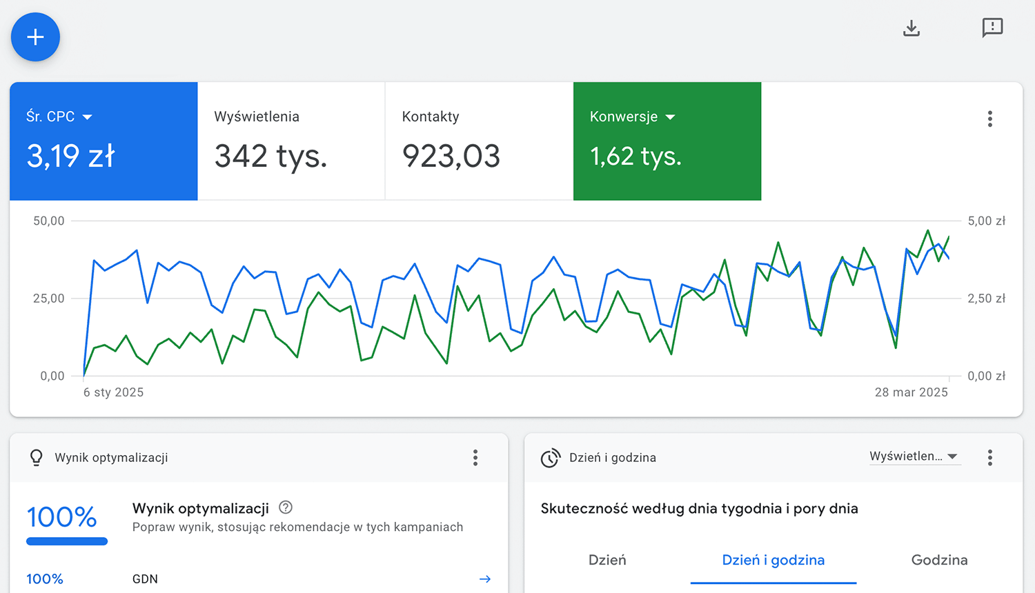 Szybka optymalizacja: 4-krotnie więcej kontaktów w 3 miesiące. Zidentyfikowałem i wyeliminowałem zbędne koszty, które ponosił mój klient – reklamodawca z branży B2B. Gdy tylko kampania przestała przepalać budżet reklamowy, liczba leadów z Google Ads drastycznie wzrosła – z niecałych 10 do ponad 40 dziennie.
